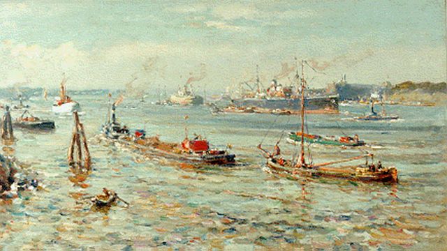 Evert Moll | Gezicht op de Rotterdamse Maas vanaf de zuidoever, olieverf op doek, 60,4 x 100,2 cm, gesigneerd r.o.