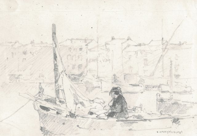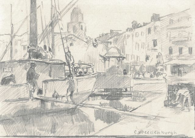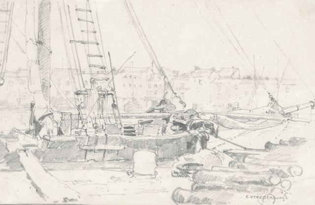 Cornelis Vreedenburgh | Vrachtschip aan de kade, potlood op papier, 12,7 x 19,9 cm, gesigneerd r.o.