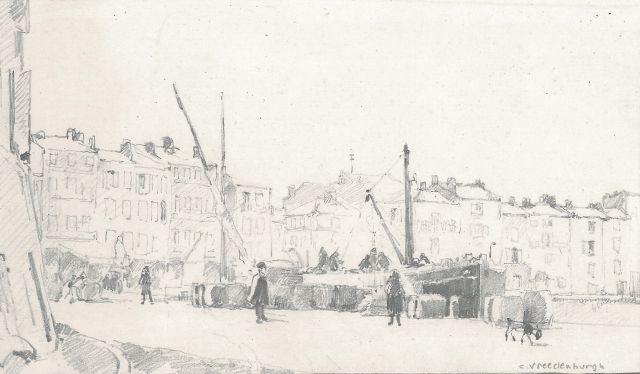 Cornelis Vreedenburgh | In- en uitladen van vracht aan de kade, potlood op papier, 10,9 x 18,9 cm, gesigneerd r.o.