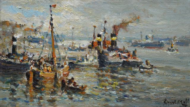 Evert Moll | Havengezicht met slepers, olieverf op doek, 20,5 x 35,2 cm, gesigneerd r.o.