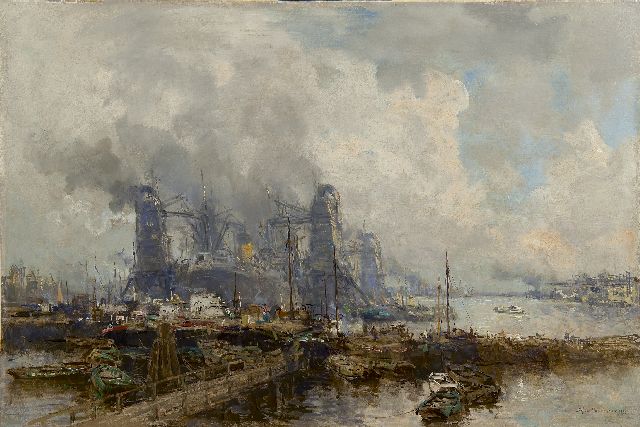 Johan Hendrik van Mastenbroek | Lichters in de Maashaven, Rotterdam, olieverf op doek, 47,4 x 71,2 cm, gesigneerd r.o. en gedateerd 1930
