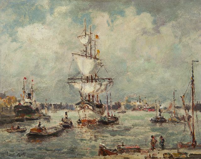 Evert Moll | Driemaster in de haven van Rotterdam, olieverf op schildersboard, 24,0 x 30,5 cm, gesigneerd l.o.