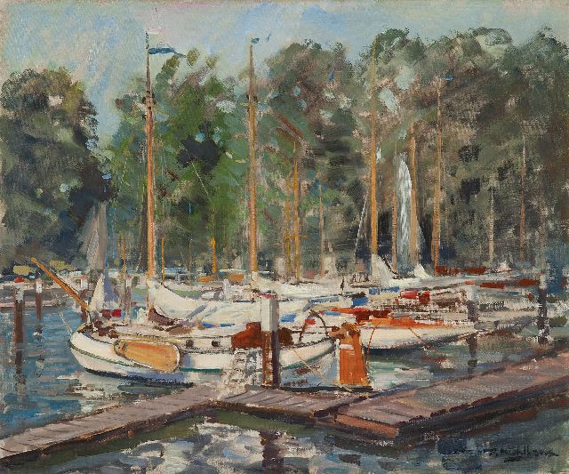 Daan Mühlhaus | Plezierjachten in de haven van de KDRZV Dordrecht, olieverf op doek, 50,0 x 60,2 cm, gesigneerd r.o.