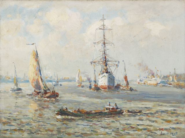 Evert Moll | Driemaster op de Nieuwe Maas bij Rotterdam, olieverf op doek, 30,1 x 40,2 cm, gesigneerd r.o.