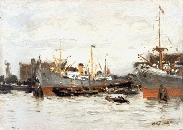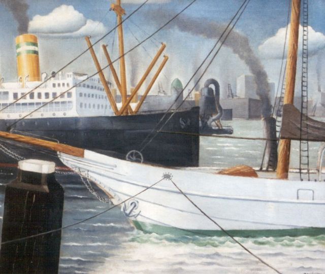 Evert Moll | Schepen in de Rotterdamse haven, olieverf op doek, 60,6 x 101,0 cm, gesigneerd l.o.