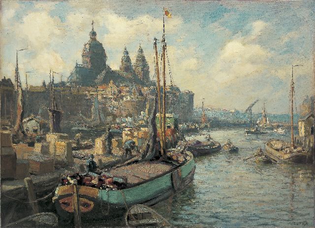 Evert Moll | Afgemeerde boten in Amsterdam met de St.-Nikolaaskerk en de Schreierstoren, olieverf op doek, 80,3 x 110,6 cm, gesigneerd r.o.