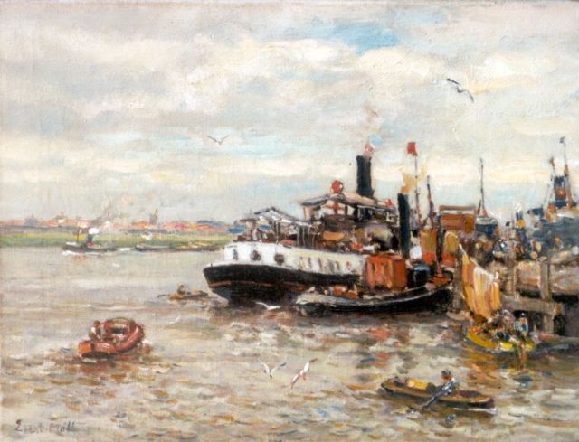 Evert Moll | Bedrijvigheid in de Maashaven, olieverf op doek, 30,3 x 40,3 cm, gesigneerd r.o.