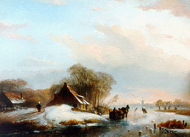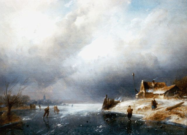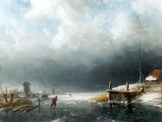 Charles Leickert | Bevroren rivier met schaatsers, olieverf op paneel, 23,6 x 32,0 cm, gesigneerd r.o.