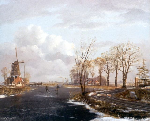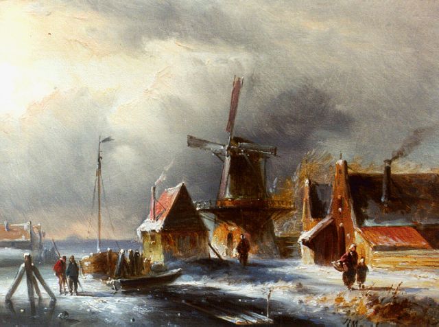 Charles Leickert | Schaatsers op een bevroren rivier bij een molen, olieverf op paneel, 37,1 x 44,9 cm, gesigneerd r.o.