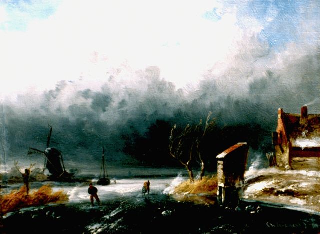 Charles Leickert | IJsgezicht bij opkomende storm, olieverf op paneel, 13,6 x 18,0 cm, gesigneerd r.o.