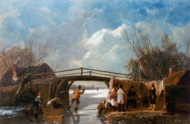 Jan Hendrik Willem Hoedt | IJsgezicht met schaatsers rond een koek-en-zopie, olieverf op doek, 35,9 x 46,7 cm, gesigneerd l.o. met monogram