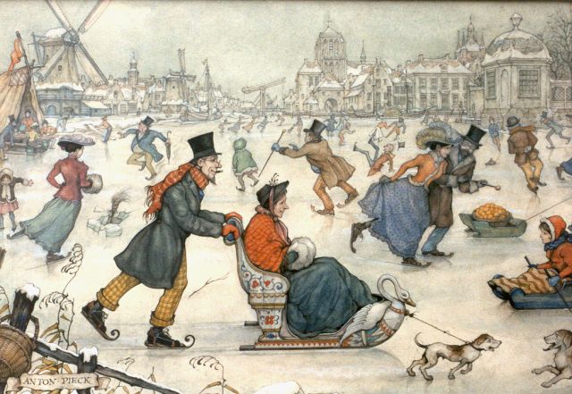 Anton Pieck | Sleetje rijden op het ijs, potlood en aquarel op papier, 31,0 x 41,5 cm, gesigneerd l.o.
