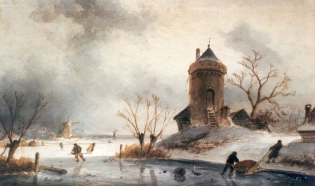 Hendrik Gerrit ten Cate | Schaatsers op het ijs, olieverf op doek, 29,2 x 35,8 cm, gesigneerd l.o. en gedateerd 1828