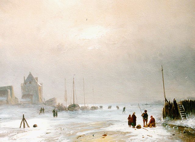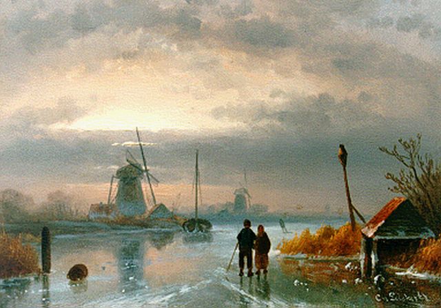 Charles Leickert | Bevroren vaart met schaatsers, olieverf op paneel, 31,8 x 49,9 cm, gesigneerd r.o.