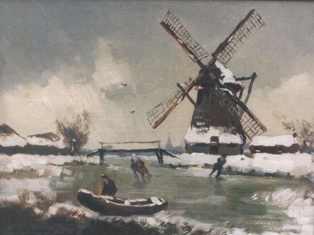 Piet Schipperus | Hollands winterlandschap met schaatsers Overschie, olieverf op paneel, 30,1 x 40,0 cm, gesigneerd l.o.