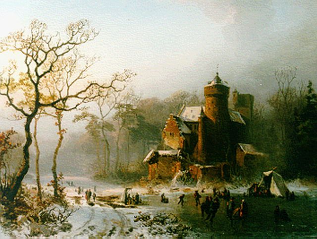 John Franciscus Hoppenbrouwers | Kasteel in winterlandschap met schaatsers, olieverf op paneel, 32,0 x 46,1 cm, gesigneerd l.o.