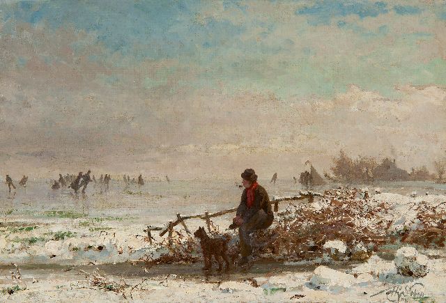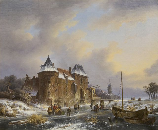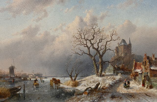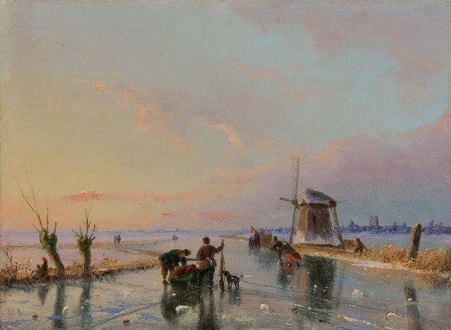 Lodewijk Johannes Kleijn | Winterlandschap met schaatsers en landvolk op het ijs, olieverf op paneel, 29,6 x 40,5 cm, gesigneerd r.o.