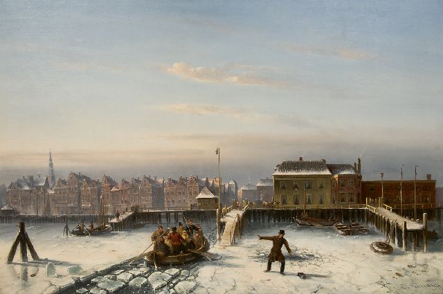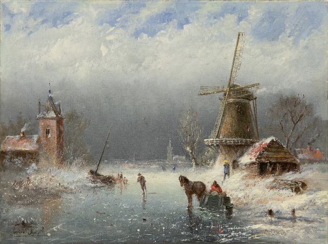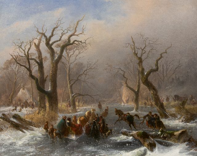 Johann Jungblut | Landvolk op een bevroren rivier, olieverf op doek, 80,3 x 115,1 cm, gesigneerd r.o. en zonder lijst
