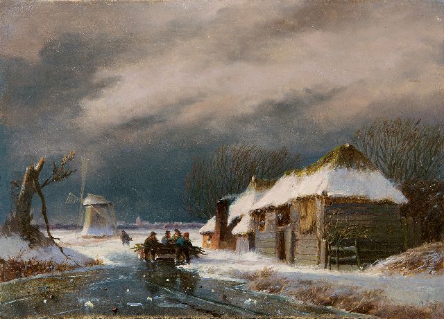 Johannes Tavenraat | Schaatsers en arrenslede op een bevroren bosbeek bij Kleef, olieverf op doek, 76,1 x 94,2 cm, gesigneerd l.o. en gedateerd 1857