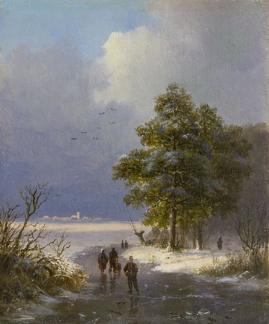 Carl Eduard Ahrendts | Winterlandschap met schaatsers, olieverf op paneel, 28,7 x 35,1 cm, gesigneerd l.o.