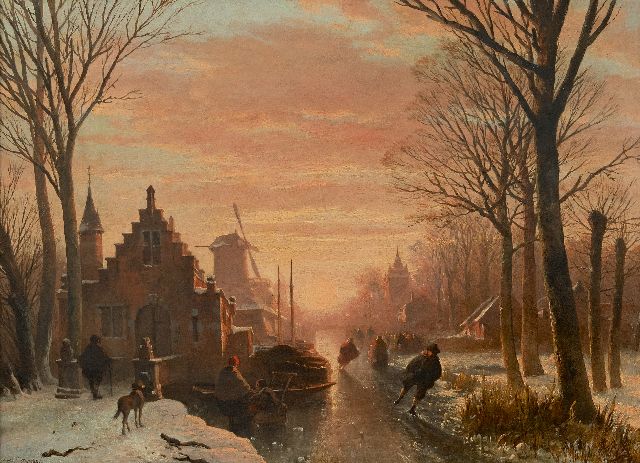 Abraham van der Wayen Pieterszen | Schaatsers op een stadsgracht bij ondergaande zon, olieverf op paneel, 43,3 x 59,3 cm, gesigneerd l.o.