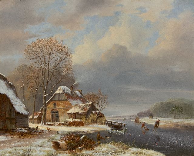 Nicolaas Roosenboom | Winters riviergezicht met schaatsers bij een boerderij, olieverf op doek, 71,2 x 87,7 cm, gesigneerd l.o.