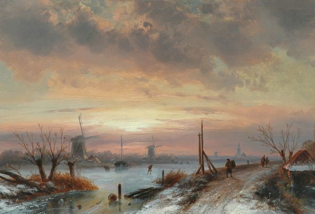 Charles Leickert | Schaatsers en wandelaars bij zonsondergang, olieverf op paneel, 29,1 x 42,5 cm, gesigneerd r.o.