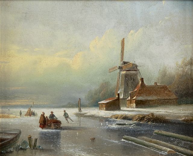 Lodewijk Johannes Kleijn | Weids ijsgezicht met figuren en molens, olieverf op paneel, 33,5 x 52,0 cm, gesigneerd r.o.