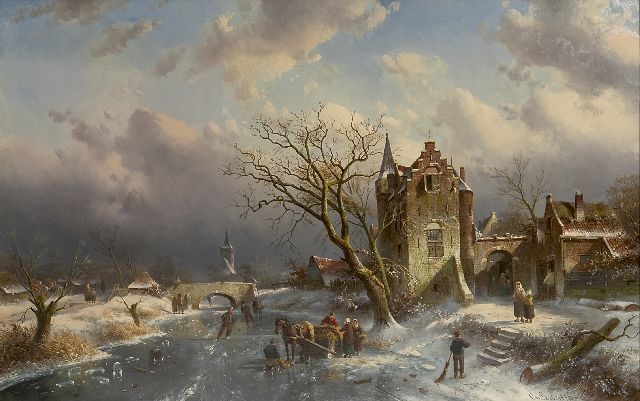 Andreas Schelfhout | Schaatsvertier op een bevroren rivier, olieverf op doek, 65,3 x 93,1 cm, gesigneerd l.o. en te dateren ca. 1855