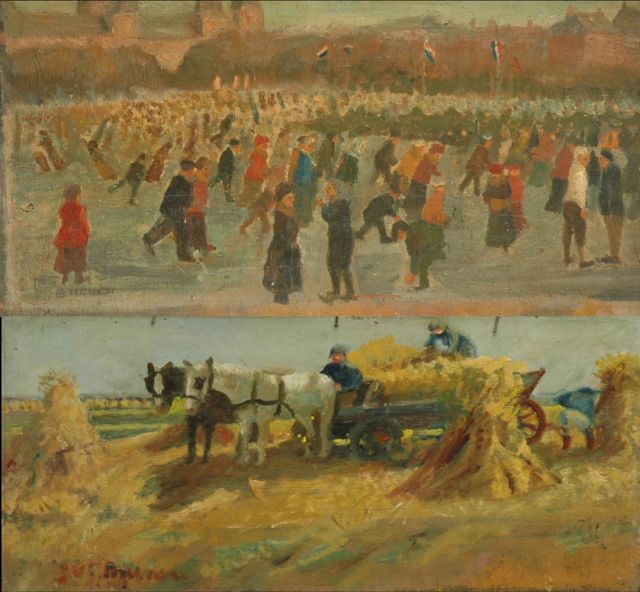 Jos Brienen | Schaatspret op het Museumplein in Amsterdam; verso: Oogstende boeren, olieverf op paneel, 28,5 x 54,3 cm, gesigneerd l.o. en verso