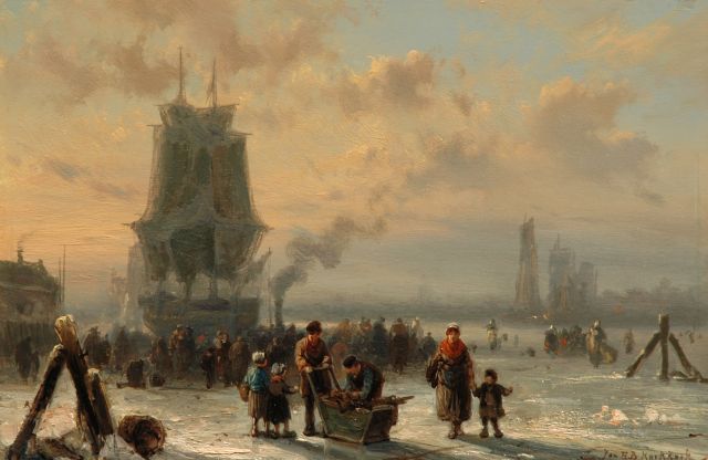 Jan H.B. Koekkoek | Drukte op het ijs, olieverf op paneel, 23,5 x 35,5 cm, gesigneerd r.o.