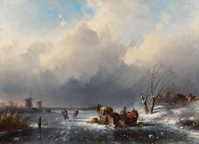 Charles Leickert | Landvolk bij een trekslede op het ijs, olieverf op paneel, 15,2 x 20,7 cm, gesigneerd r.o.