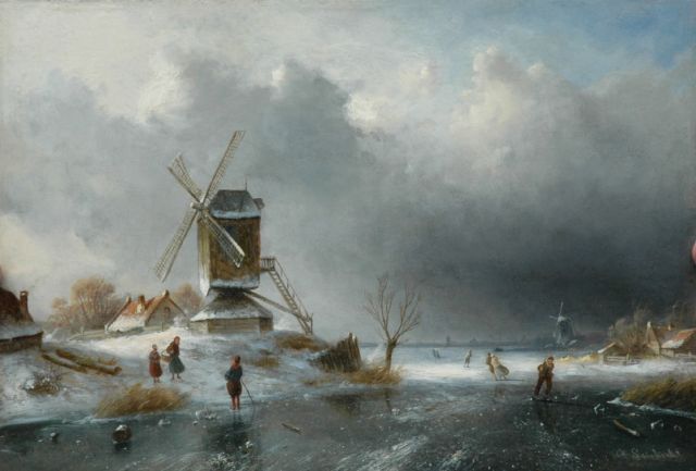 Charles Leickert | Molen langs een bevroren vaart, olieverf op paneel, 26,0 x 38,0 cm, gesigneerd r.o.