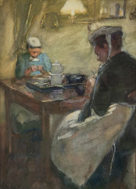 Lammert van der Tonge | Larens interieur met vrouw en handwerkend meisje, olieverf op doek, 54,3 x 45,2 cm, gesigneerd r.o.