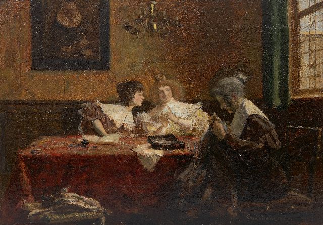 Carel Dake | Drie vrouwen in een interieur, olieverf op paneel, 34,9 x 49,1 cm, gesigneerd r.o. en gedateerd 1908