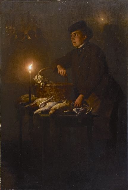 Wildverkoper op de Groenmarkt in Den Haag, bij avond (alleen tezamen met pendant van 'Bij de wildstal' 14607)