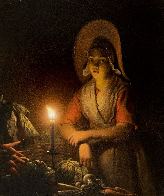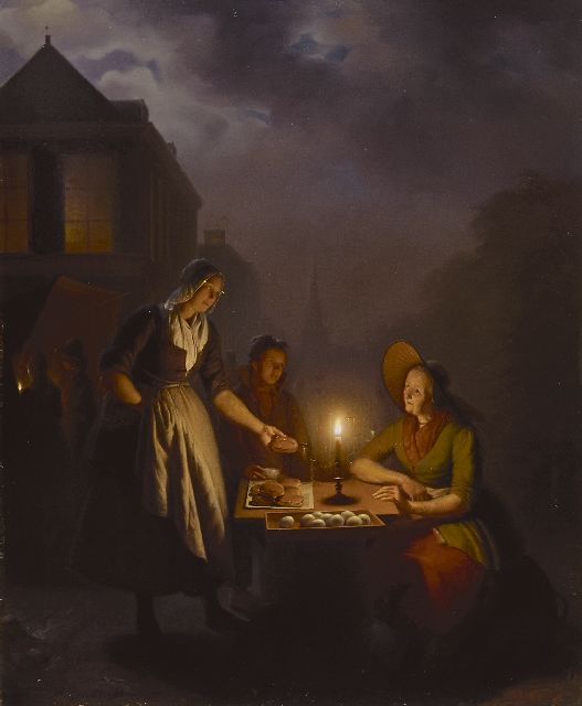 Petrus van Schendel | Scheveningse groenteverkoopster bij kaarslicht, olieverf op paneel, 19,4 x 16,5 cm, gesigneerd r.b. en verso en r.b. en verso gedateerd 1842