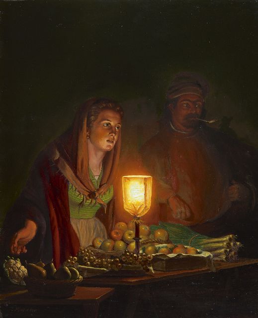 Johannes Rosierse | Avondmarkt met groenten- en fruitverkopers, olieverf op paneel, 31,0 x 25,8 cm, gesigneerd l.o.