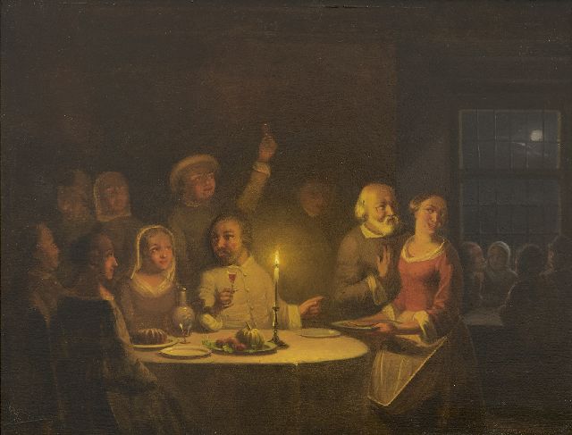Pieter Gerardus Sjamaar | Vrolijk gezelschap bij kaarslicht, olieverf op paneel, 21,9 x 28,4 cm, gesigneerd r.o.