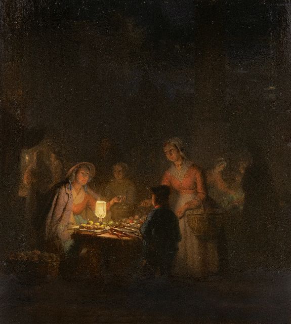 Petrus van Schendel | De vismarkt te Den Haag bij avond, olieverf op paneel, 84,3 x 69,4 cm, gesigneerd r.o.