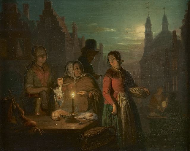 Jan Hendrik van Grootvelt | Op de avondmarkt, olieverf op paneel, 17,7 x 15,6 cm, gesigneerd verso en verso gedateerd 1841