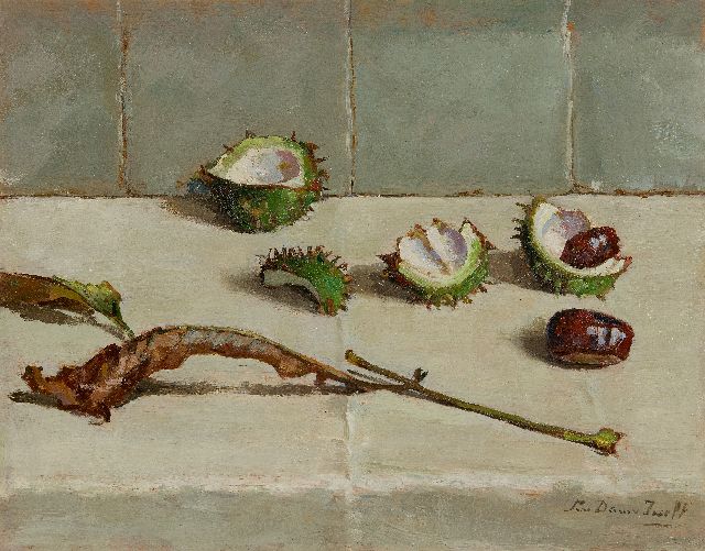 Lucie van Dam van Isselt | Stilleven van kastanjes, bolsters en blad, olieverf op paneel, 31,7 x 40,1 cm, gesigneerd r.o.