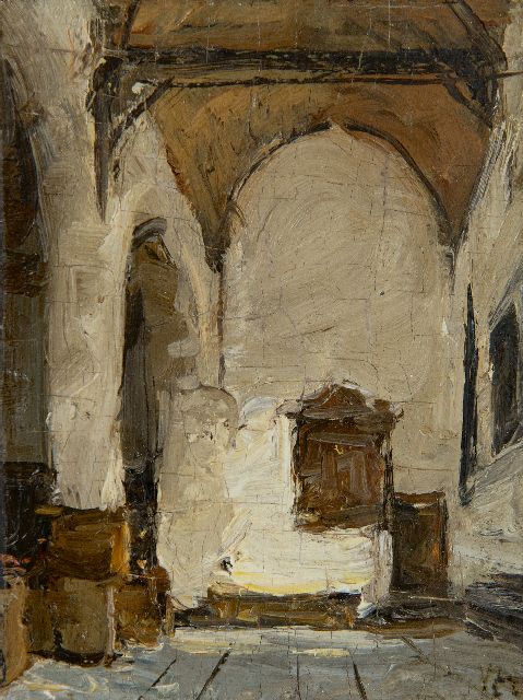 Jan Hendrik van de Laar | Kerkinterieur, olieverf op paneel, 36,9 x 27,9 cm