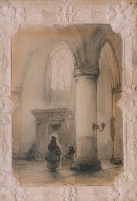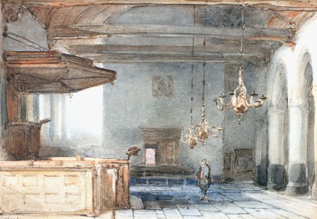 Johannes Bosboom | Kerkintieur, aquarel op papier, 15,0 x 9,0 cm