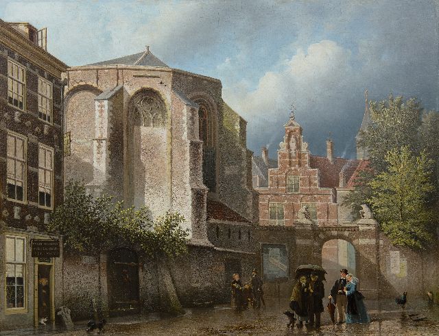 Stadsgezicht met het portaal van de Kleine Kerk te Edam