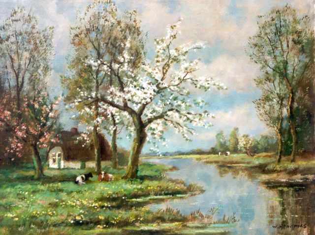 Cor Bouter | Rivierlandschap met boerderij en koeien in een boomgaard, olieverf op doek, 30,7 x 40,9 cm, gesigneerd r.o. 'W. Hendriks'
