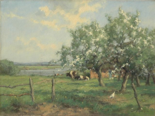 Cor Bouter | Bloeiende boomgaard met vee, olieverf op doek, 41,0 x 51,2 cm, gesigneerd l.o. 'W. Hendriks'