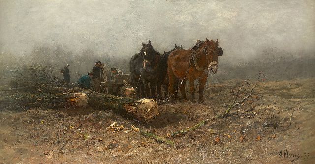 Anton Mauve | Houthakkers, boomstammen en mallejan met paarden, olieverf op doek, 106,6 x 205,8 cm, gesigneerd r.o. en gedateerd '77