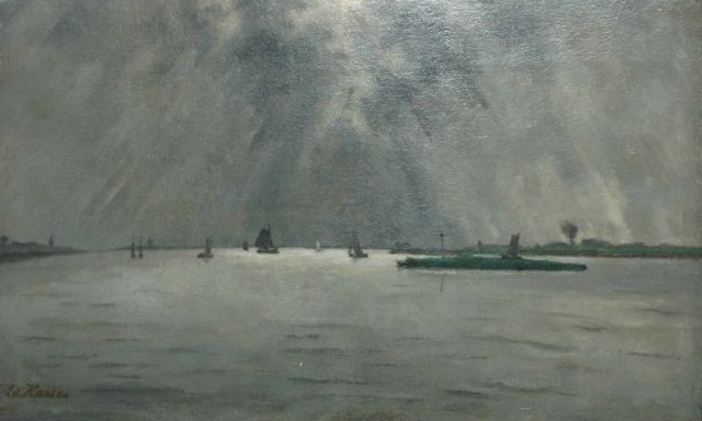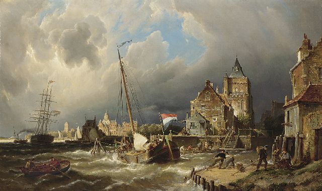 Pieter Cornelis  Dommershuijzen | Beurtschip in de havenmonding van Dordrecht bij opkomende storm, olieverf op doek, 75,3 x 127,0 cm, gesigneerd l.o. en gedateerd 1885