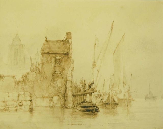 Andreas Schelfhout | Zeilschepen bij een aanlegplaats, penseel in bruine inkt op papier, 15,0 x 18,5 cm, gesigneerd l.o.